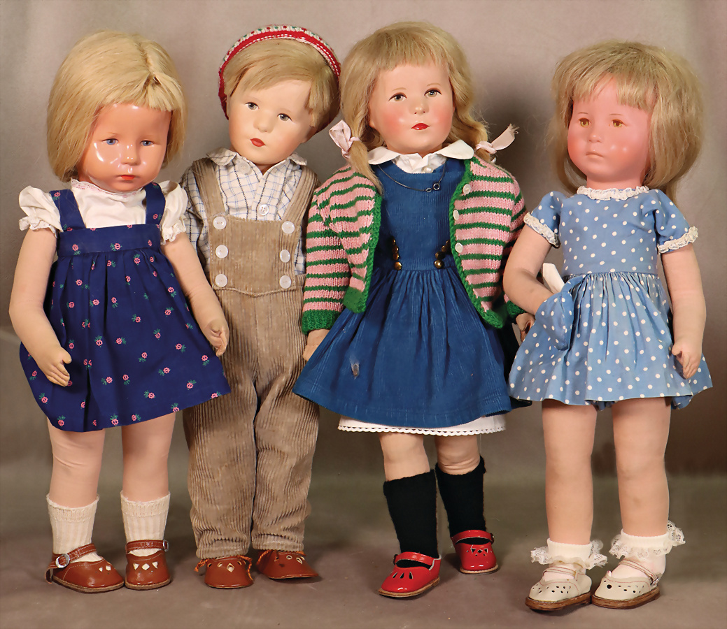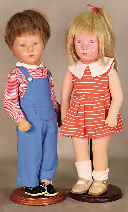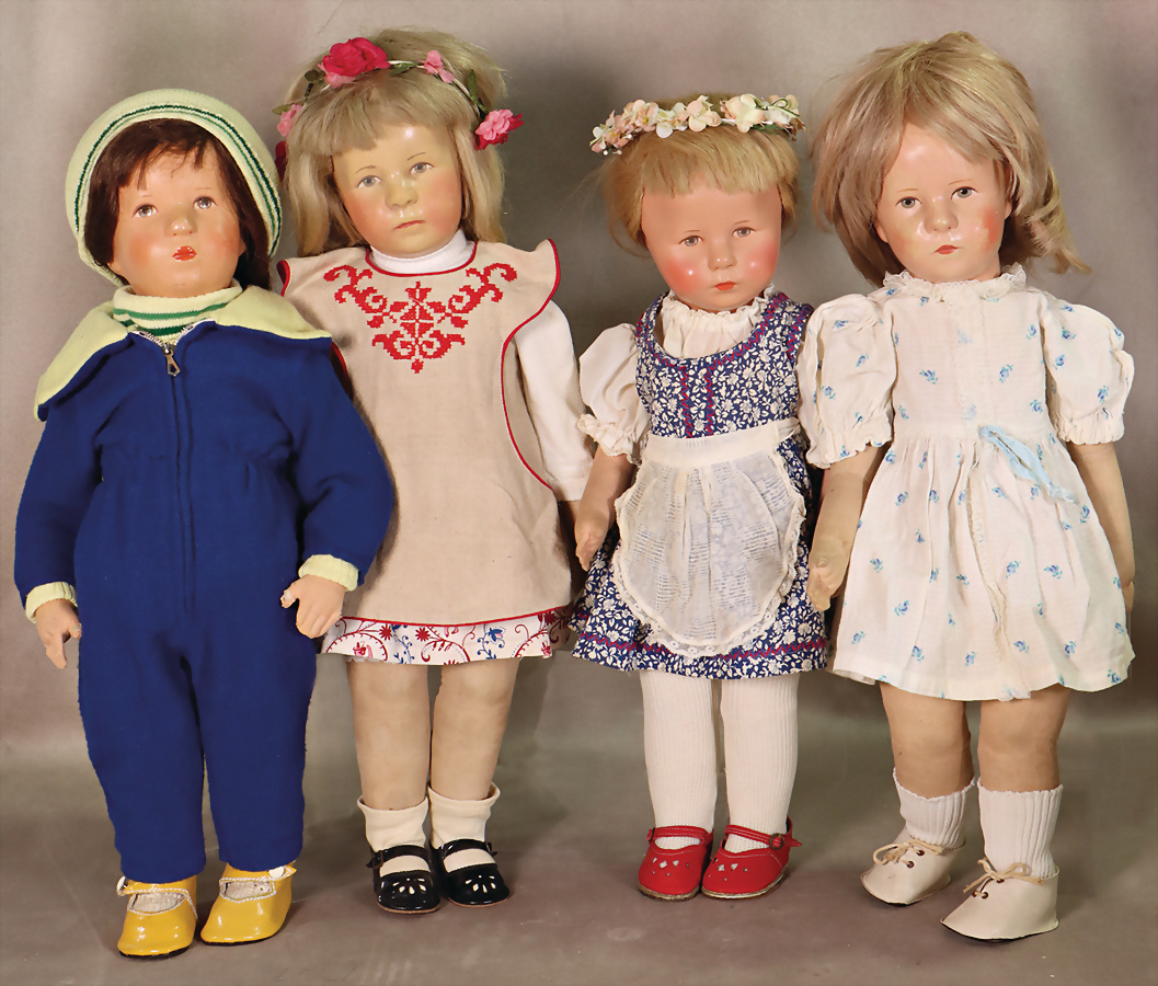 Konv. Mädchen, 52 cm, Stoffkopf, Hinterkopfnaht erst unter der Perücke sichtbar, in den Kniekehlen abgenäht, Körper etwas verschmutzt, Junge, Stoffkopf, Hinterkopfnaht erst unter der Perücke sichtbar, 48 cm, Kopf wohl 1x bei KÄTHE KRUSE überarbeitet, Farbabweichung an der Halskrause, Körper bespielt mit kl. Fehlstellen, 1x Mädchen, Kopf Tortulon, guter Zust., Mädchen, Stoffkopf, Hinterkopfnaht erst unter der Perücke sichtbar, 51 cm, Kopf wohl 1x bei KÄTHE KRUSE überarbeitet