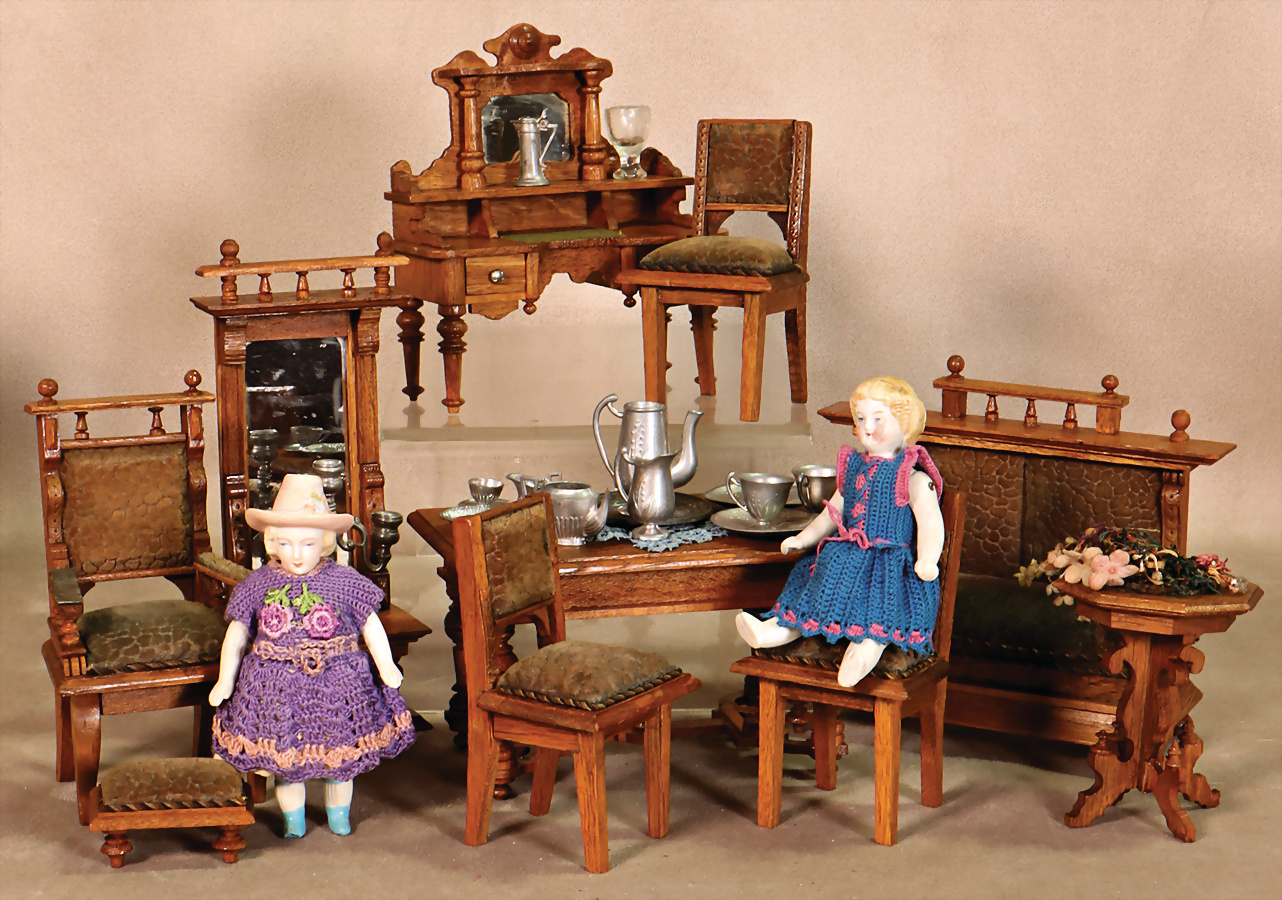 Gründerzeit, Möbelprogramm, Sitzgruppe, 1 Schreibtisch mit Spiegel, H: 16,5 cm, Sofa, 15,5 cm, breit, 2 Ganzbiskuit-Puppen, neuere Produktion, einige Zinnteile