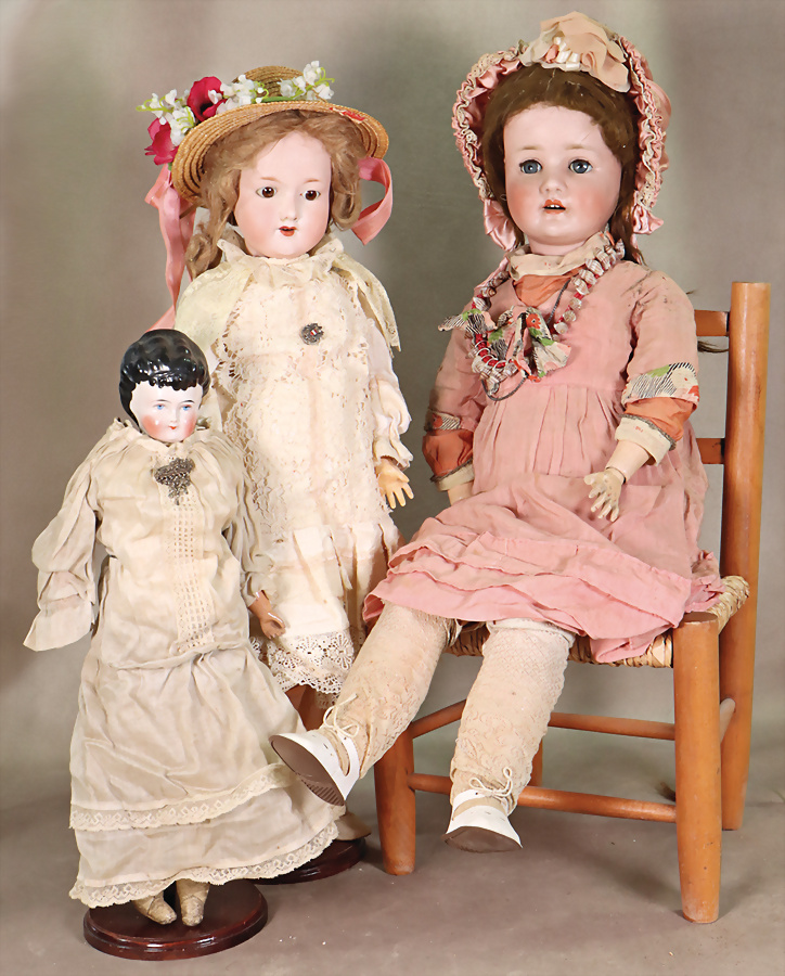 Konv. Puppen, SIMON & HALBIG, 1079, Porzellankopf-Puppe, 62 cm, Kurbelkopf, blaue Schlafaugen, off. Mund, oben Zähne, durchstochene Ohren, an der Kurbel restauriert, Gliederkörper, Echthaar-Perücke, Kleidung aus alten Stoffen genäht, Porzellankopf-Puppe, 65 cm, Kurbelkopf, blaue Schlafaugen, durchstochene Ohren, off. Mund, oben Zähne, Kinngrübchen, Gliederkörper, Echthaar-Perücke, Porzellan-Brustblattkopf-Puppe, SIMON & HALBIG, 1010, nachträglich fest eingesetzte Glasaugen, off. Mund, oben Zähne, durchst. Ohren, Lederkörper, Holz-/ Massearme, farblich überarbeitet