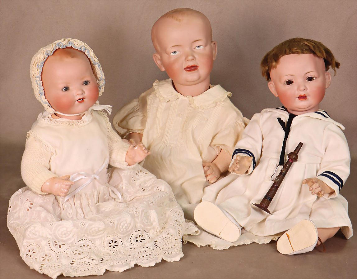 Konv. Puppen, Beylo Baby, 72 cm, Einbindekopf-Baby, Kopf zerbrochen u. geklebt, Finger weggebrochen, gr. Puppe SIMON & HALBIG / KÄMMER & REINHARDT, 76 cm, Kurbelkopf, blaue nachträglich fest eingesetzte Glasaugen, Kopf zerbrochen u. geklebt, Gliederkörper, alte Echthaar-Perücke, KESTNER, Porzellan-Brustblattkopf-Puppe, 70 cm, braune Schlafaugen, sitzen etwas nach oben, off. Mund, oben Zähne, Orig.-Gipsdeckel wurde nicht entfernt, von außen keine Risse erkennbar, Lederkörper, Porzellan-Unterarme, Kopf wirkt etwas kl. zum Körper, alte Mohair-Perücke