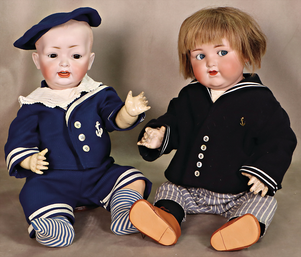 2 Teile, Puppen, KÄMMER & REINHARDT, 126, 70 cm, Kopfmarkierung 62 cm, Größenunterschied aufgrund des Toddler-Körpers, blaue Schlafaugen, off. Mund, Zähne u. Zunge, Mohair-Perücke ein wenig zu klein, KLEY & HAHN, 192 1930, Charakter-Baby, 64 cm, blaue Schelmenaugen, off. Mund, oben Zähne, Toddler-Körper, Kopf in Scherben zerbrochen u. geklebt, Echthaar-Perücke