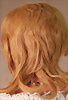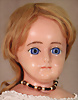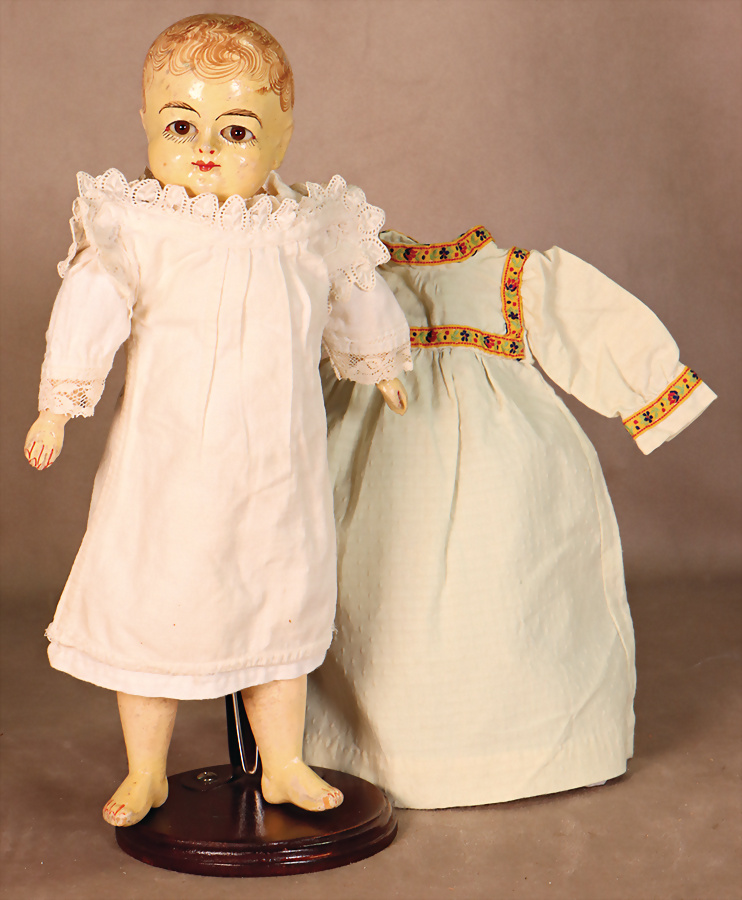 Wachs überzogene Papiermaché-Puppe, 64 cm, Echthaar-Perücke, fest einges. blaue Glasaugen, geschl. Mund, Stoffkörper, Masse-Arme u. –Beine, ausdrucksstark