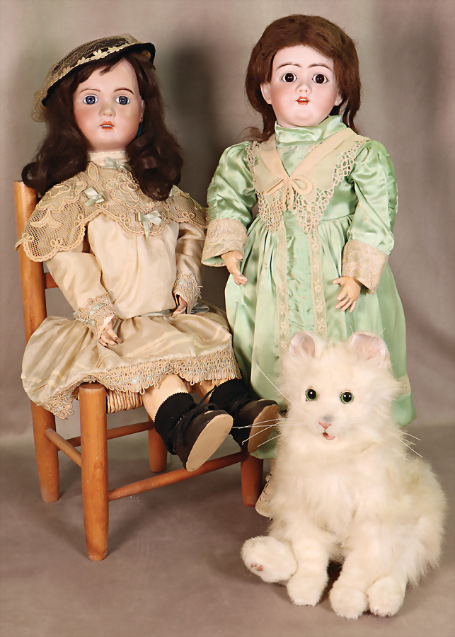 EMILE JUMEAU, Porzellankopf-Puppe, Frankreich, 70 cm, Kurbelkopf, Kopf zerbrochen u. geklebt, franz. Gliederkörper, Echthaar-Perücke, Porzellankopf-Puppe, gem. 14.99, DEP Germany H 5½, 70 cm, Kurbelkopf, braune Schlafaugen, off. Mund, oben Zähne, durchst. Ohren, Perücken-Pull, Gliederkörper, Echthaar-Perücke, 1 außergewöhnliche Fellkatze, neuere Produktion, Sitzhöhe 35 cm