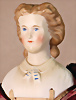 Porzellan-Brustblattkopf-Puppe, 40 cm, fein ausmodell. Haare, blaue gemalte Augen, geschl. Mund, anmodell. Dekolleté, Stoffkörper, glasierte Porzellan-Arme, Porzellan-Beine