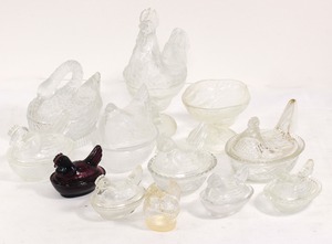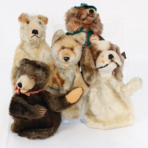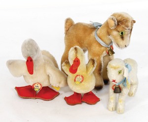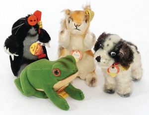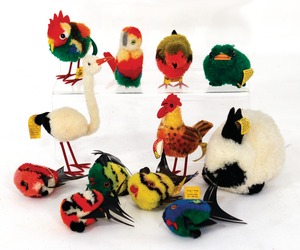 Konv. 11 Wolltiere, alles mit Knopf u. Fahne, u.a. Storch, Kunststoffbeine, Nr. 7460/11, Papagei, Huhn u. Küken, 1 Frosch, 5 Fische, 1 Hase, dazu 1 Huhn, fest gestopft, kompl., Nr. 3370/10, Kunststoffbeine