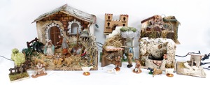 Weihnachtsgrippe, Grundplatte ca. 50 x 40 cm, teils aus Kork gearbeitet, bemalt, mit reichh. Zubehör, Hühnerstall, Massefiguren