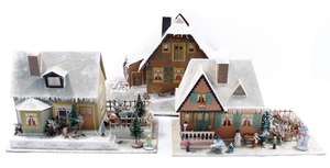 3 Weihnachtshäuser, beflockt, mit kl. Erzgebirge- u. Massefigürchen, bespielt, Grundplatte 40 x 19 cm