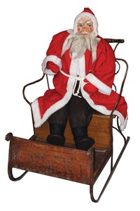 alter Holzschlitten, Metallkufen, Griffhöhe 85 cm, dazu 1 Nikolaus, Stoff, weich gestopft, Filzgesicht, Handarbeit der Künstlerin Thea Graf, ca. 100 cm