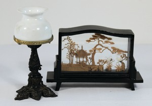 Gusslampe, mit Glasschirm, Höhe 14,5 cm, dazu 1 japanische Landschaft in kl. Glasvitrine, aus Kork, Länge 16 cm