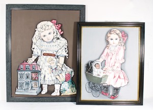 2 Ölgemälde, signiert Wiebke 82, mit jeweils Jumeaupuppen u. Spielwaren, in Holzrahmen, 64 x 52 cm, u. 76 x 62 cm