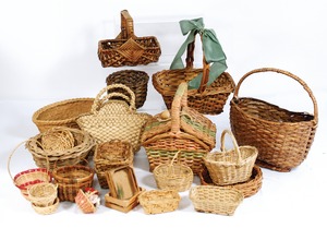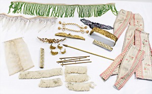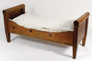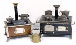 Puppen-Zubehör für den großen Waschtag, Bügeleisen, Waschbrett, Mangel, 4 Porzellan-Seifenschalen mit Deckel, kl. Ecke weggebrochen, Bügeleisen, einige Kleidungsstücke, 1 kleinere - mittlere Puppe, 4 Babyhauben, Baumwolle mit Spitze, kleiner Deckelkorb, Silberrassel, kleines Körbchen mit Celluloid-Baby