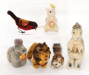 Konv. Tiere, Känguru Linda, mit Schild u. Knopf, 14 cm, Pieps Maus, kompl., Nr. 4308,04, Snobby, Nr. 4435/10, Leo, Nr. 0800/10, 1 Schuco-Vogel zum Aufziehen, Drahtfüße, Uhrwerk intakt, kl. Waschbär