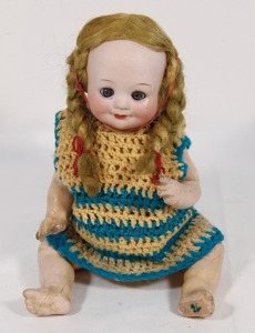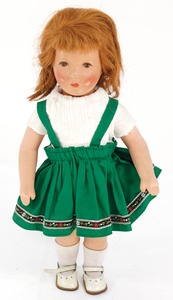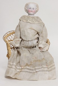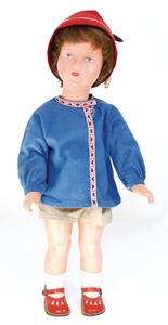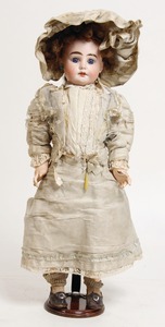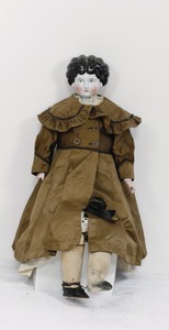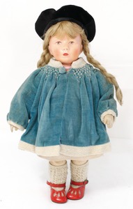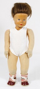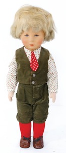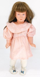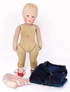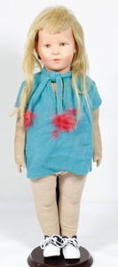 Puppe, deutl. sichtbare Hinterkopfnaht, Perücke fehlt, starke Krakellee-Bildung, an Augen, Mund u. Wangen übermalt, auf Stoffkörper mit breiter Hüfte, einige Mottenlöcher an den Händen, 42 cm