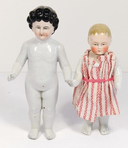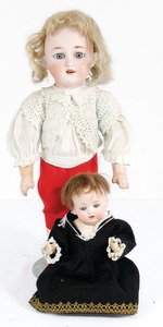 Porzellankopf-Puppe, gem. 5700, graue fest eingesetzte Glasaugen, off. Mund, Zähne oben, Mohairperücke, auf Masse-Gliederkörper, Unterarme überstrichen, Finger stärker beschädigt, 35 cm, dazu kl. Porzellan-Babypuppe, gem. Germany 23, blaue Schlafaugen, off. Mund, Zähne, Echthaarperücke, auf Masse-Sitzbabykörper, 23 cm