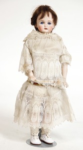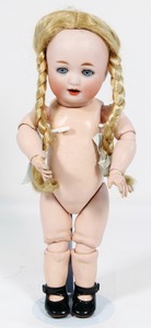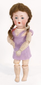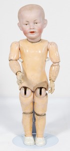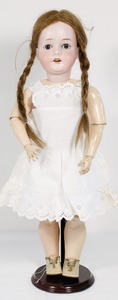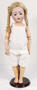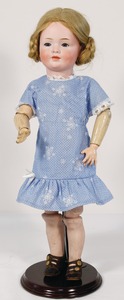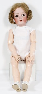 Porzellan-Charakterpuppe, gem. 5365, blaue nachtr. eingesetzte Schlafaugen, off./geschl. Mund, Echthaarperücke, auf Masse-Gliederköper, Arme nachtr. ergänzt, Kopf u. Körper nicht zueinander passend, 43