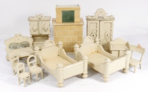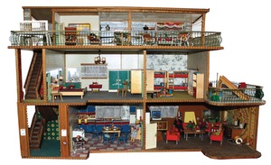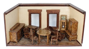 2-tlg. Puppenstube mit Erker, wohl Gottschalk, 83 x 40 x 31 cm, mit einigen Teilen Puppenstuben-Mobiliar, Wohnzimmer, 2-türiger Schrank, verglast, 20 cm, mit Couch, Tisch, 2 Stühle, Spiegeltisch, kl. Porzellan-Brustblattkopf-Puppe, kl. Küche mit Blechherd, einige Celluloid-Püppchen, mit einigen Teilen Zubehör