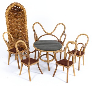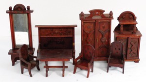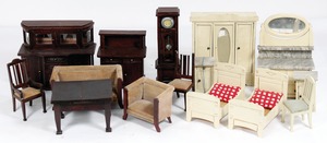 Puppenstuben-Möbelprogramm, Holz, Wohnzimmer, Schrank, Höhe 22 cm, Kommode, Spiegel, Couch mit Überbau, Tisch u. 3 Stühle