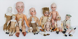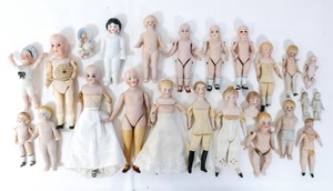 kl. Porzellan- und Massepuppen, 3x Brustblattkopf mit Stoffkörper, 10,5 cm – 17 cm, 5 x mit Massekörper, bewegl. Arme und Beine, anmodellierte Schuhe und Strümpfe, 11 cm – 20 cm, bitte besichtigen