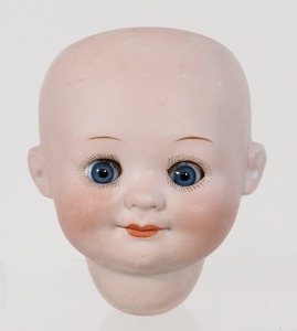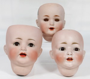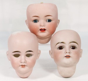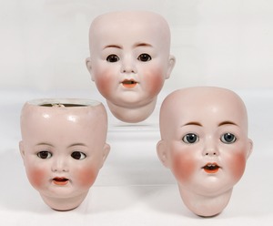 3 Porzellan-Puppenköpfe, Simon & Halbig, Nr. 166/10, braune Schelmenaugen, off. Mund, 2 Zähne Oben, Zunge, Altbeck u. Gottschalk, gem. 1361/45, braune Schlafaugen, Nasenlöcher, Zähne fehlen, Hertel, Schwab & Co., gem. Germany 98/11, blaue Schlafaugen, Augenmechanismus lose, off. Mund, 2 Zähne oben, Nasenlöcher