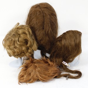 Puppe, Kunststoffkopf, mit aufgeklebter Kurzhaarperücke, dazu 2. Perücke, Nasenspitze berieben, Stoffkörper stellenw. angeschmutzt, 36 cm