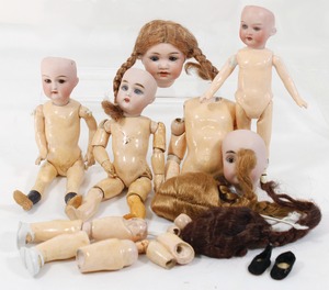 Konv. Puppen-Brustblattköpfe, Porzellan u. 2x Celluloid, AM gem. 8, mit braunen Schlafaugen, fest aufgeklebter Perücke, 1x Schoenau & Hoffmeister, gem. 4700, braune fest eingesetzte Glasaugen, off. Mund, Zähne, 1x Simon & Halbig, 10, 2 glasierte Brustblattköpfe, schwarz modellierte Frisur, 2 Köpfe gem. Halbig 1079, 192, Damenkopf, Wachs überzogen, seitl. geneigt, mit Mohairperücke, gemalte Augen, 2x Minerva, Nr. 2 u. Nr. 6