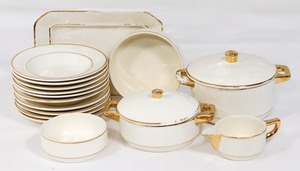 Kindergeschirr, Porzellan, beige mit Goldrand, teils etwas abgegriffen, 2 Suppenterinen, Durchm. 10,5 cm, Platte, Soucier, 2 Schüsseln, 6 Tiefe u. 4 flachs Teller