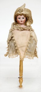 Marotte, Porzellan-Brustblattkopf, blaue fest eingesetzte Glasaugen, off. Mund, Zähne, etwas angeschmutzt, Uhrwerk intakt, 28 cm