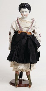Porzellan-Brustblattkopf-Puppe, schwarz modellierte Frisur, blaue gemalte Augen, auf Stoffkörper, Porzellan-Unterarme, Daumen bestoßen, geschnitzte Unterschenkel mit Stiefel, 44 cm, in Tracht