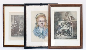 3 gerahmte Bilder, 1x Kreidezeichnung, von Rosamarie Richter, gerahmt 44 x 34 cm, 2 x Drucke, Mäusefang, nach dem Gemälde von L.D. Metz, Strickschule nach dem Gemälde von H. Kaulbach