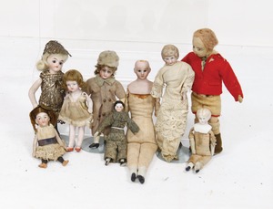 schönes Konv. Puppenstuben-Puppen, teils Brustblatt, mit Stoffkörper, oder Ganzbiskuit, zwischen 5 und 15 cm, bitte besichtigen