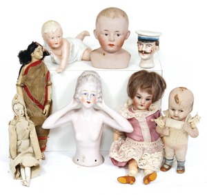 Konv. Porzellan-Figuren u. Puppen, u.a. Porzellankopf-Puppe, gem. 3, blaue Schlafaugen, off. Mund, Zähne, Mohairperücke, auf Masse-Stehkörper, mit anmodellierten Schuhen u. Strümpfen, 18 cm, Heubach Vollkopf, Brustblatt, gem. 3, blaue gemalte Augen, geschl. Mund, kl. Pianobaby von Heubach, Bein geklebt, kl. Porzellanabplatzer am Fuß, Porzellan-Baby, mit anmodellierten Schuhen u. Strümpfen, 11 cm, Halbpuppe, Kopf geklebt, Männerkopf, mit Mütze u. Schnurrbart, 1 Grödnertal Puppe, Holz, 14 cm, 1 Masse-Puppe, wohl Indianerin, 16 cm