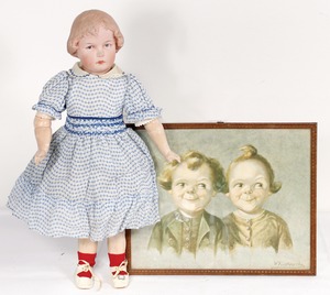 Porzellankopf-Puppe, Vollkopf, gem. 8, blaue Intaglio-Augen, geschl. Mund, stark ausmodell. Haare, Replika, auf Masse-Gliederkörper, feste Handgelenke, Körper stellenw. überstrichen, 44 cm, dazu 1 Druck gerahmt, Max & Moritz, vom W. Fialkowska, 31 x 25 cm