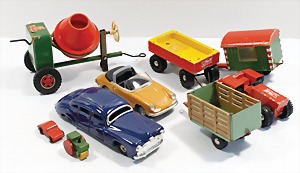 Holztraktor mit Anhänger, Bauwagen, Betonmischmaschine, 1 Steiff-Anhänger Blech, dazu 2 Blechfahrzeuge, gem. Made in Germany, 1x Porsche, Hersteller ?