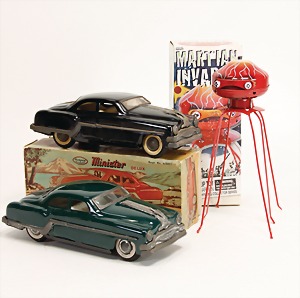 2 Blechlimousinen, Friktionsantrieb, 1x im Orig.-Kart. Aufschrifft: Minister Deluxe, wohl Made in China, dazu 1 Blech-Raumschiff, Reproduktion, Made in China, im Orig.-Kart., Martian Invader