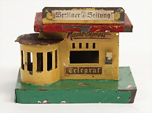 kleiner Zeitungskiosk, Aufschrift: Berliner Zeitung, Nachtexpress, H:7,5x9 cm, altersbedingte kleine Farbabplatzer und Verformung an der Grundplatte