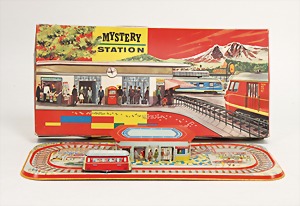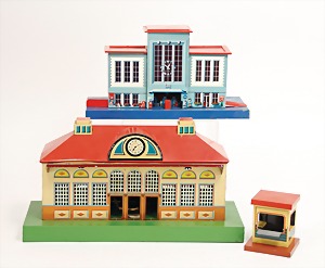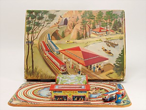 Bahnhof, Blech, lithogr., 34 cm breit, 19 cm hoch, Flugrost an der Bodenplatte, Bahnhof mit Kassenhäuschen innen, deutsch, Vorkrieg