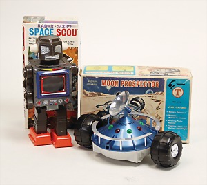 2 Teile Space Radar Scope Space Scoute, Roboter, Blech- u. Kunststoffteile, Batterieantrieb, 22,5 cm, sehr guter Zust., Orig.-Kart., Moon Prospector Hongkong, Kunststoff, sehr guter Zust. Orig.-Kart., beides technisch nicht geprüft