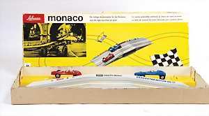 Monaco 2500, Bahn, 2 Fahrzeuge, Kunststoff, Brücke, Drahtteile, sehr guter Zust., im Orig.-Kart. blaues Fahrzeug Nr. etwas abgegriffen