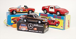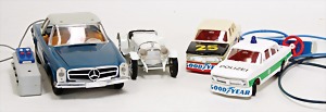 Konv. Renn u. Sportwagen, untersch. Hersteller, Dickie, Mercedes SL 500, mit 3 Kanal Funkvsteuerung, Kunststoff, 36 cm, neuwertig, Orig.-Kart., Matchbox, Inframobil Fernlenkauto, Porsche 928 GT, Kunststoff, 22 cm, Alps Japan, BMW Turbo, Prototyp, 25,5 cm, Batterieantrieb, Kunststoff, Lotus Racer, Hongkong, Kunststoff, 24,5 cm, Tippco Elektro, Bausatz 1441, Mercedes 230 SL mit starkem Elektromotor, nicht montiert, alles neuwertig, Orig.-Kart., Schuco Porsche Targa Turbo 5123, Mehrkanal-Funksteuerung, Gama Tyrrell 4872 Rennwagen, Kabelsteuerung, Kunststoff, neuwertig, im Orig.-Kart.