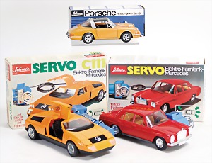 Servo Elektro Mercedes 5311, Porsche Taga 911 S, 1081, Schuco Servo C 111, Mercedes Elektro Fernlenk, alles neuwertig, Orig.-Kart.