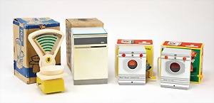 Konv. Spielzeug für Mädchen, Blech, MS Waschmaschine, 801, MS Waschmaschine 8800, Tippco Waage, Kunststoff, 218, Tischkühlschrank, Modell AEG 202, Blech u. Kunststoffteile, alles neuwertig, Orig.-Kart.