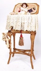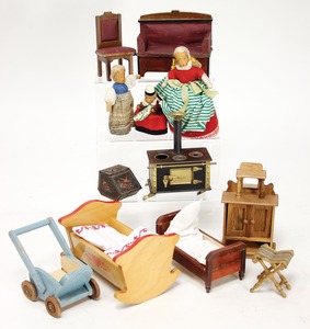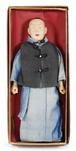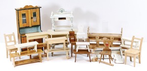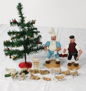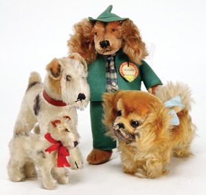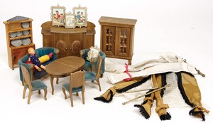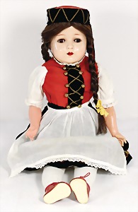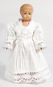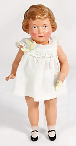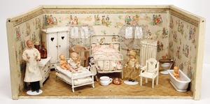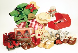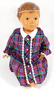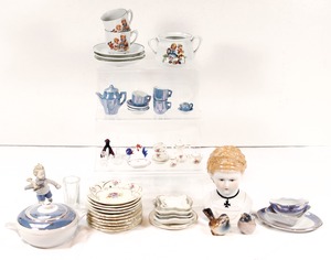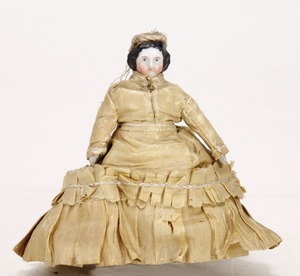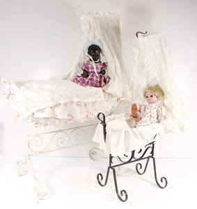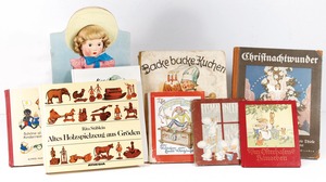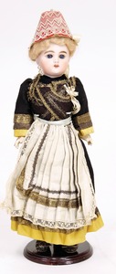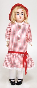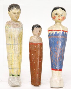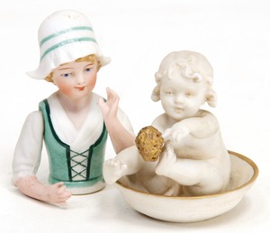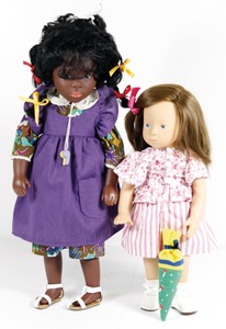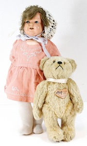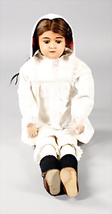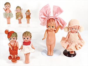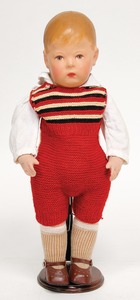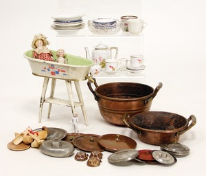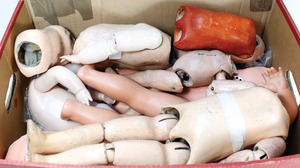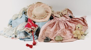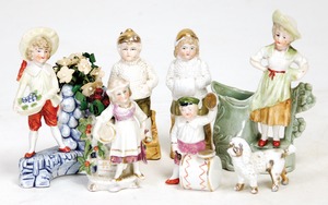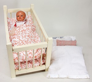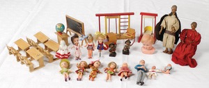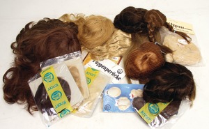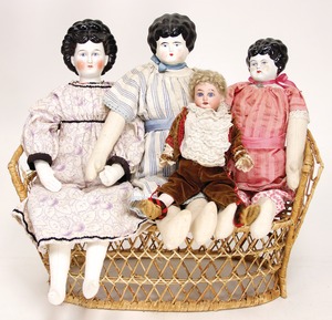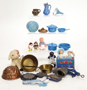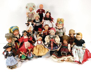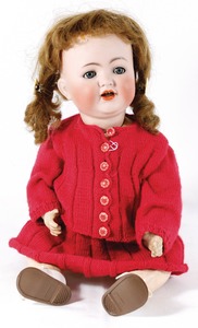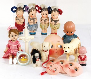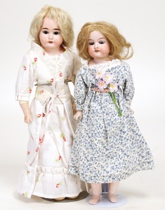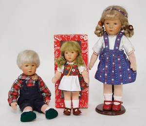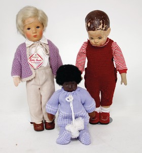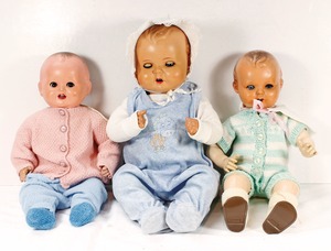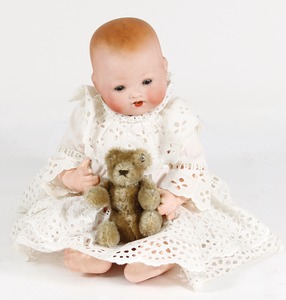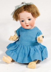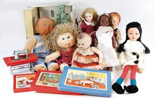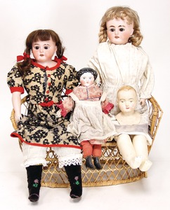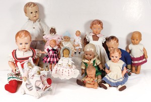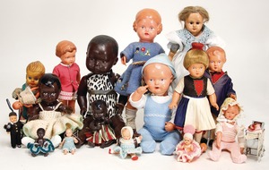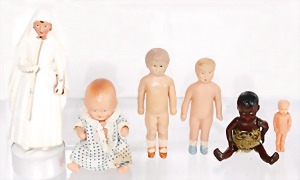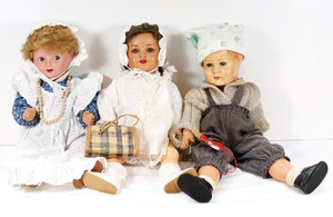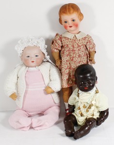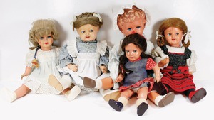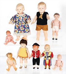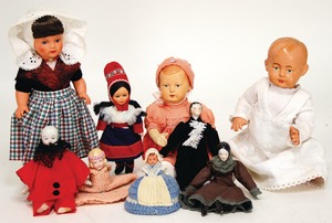 Konv. Masse, AM 520, Einbindekopf-Baby, 22 cm, blaue Schlafaugen, K&W 155/7, blaue Schelmenaugen, off. Mund, oben Zähne, Masse-Stehkörper, alte Kleidung, Kunsthaarperücke, Masse-Brustblattkopf-Puppe, gemalte Augen, Stoffkörper, Masse-Arme u. -Beine, 50 cm, durch Ziehen von Schnüren am Rücken bewegen sich die Beine, Spannungsrisse auf der Stirn sowie am Hinterkopf, Einbindekopf-Massebaby, Kunsthaarperücke, 1 Brustblattkopf-Puppe, 50 cm, Beine bewegl. durch Faden am Rücken, 1 Blech-Brustblattkopf-Puppe, Glasaugen Stoffkörper, Kunststoff-Hände, 25 cm, 1 Gummipuppe, altersbed. starke Rissbildung, Arm u. Bein getaped