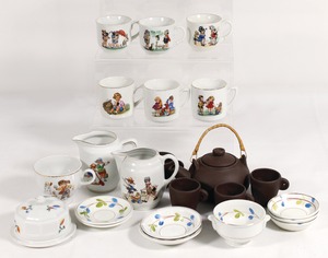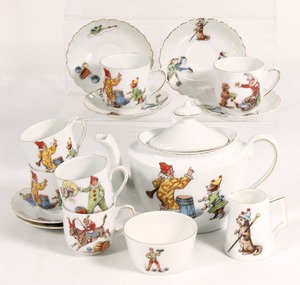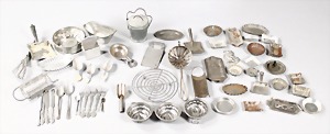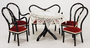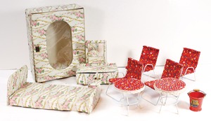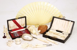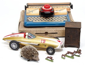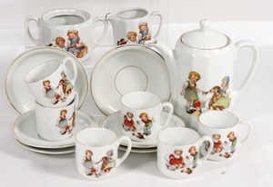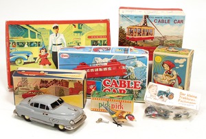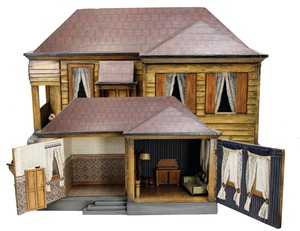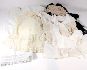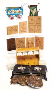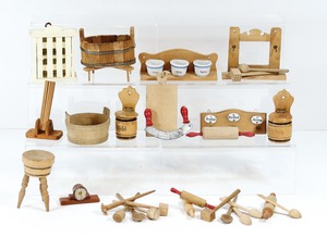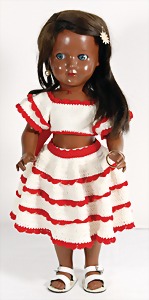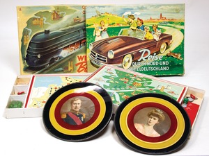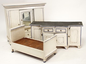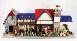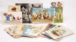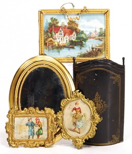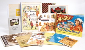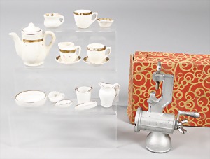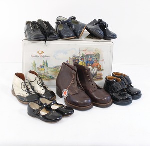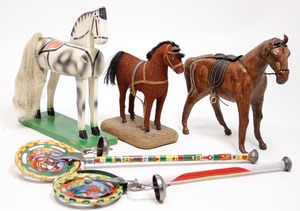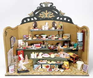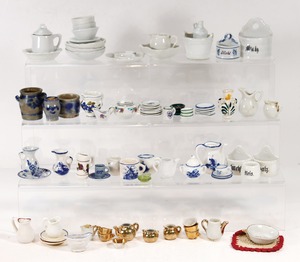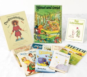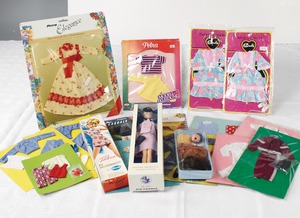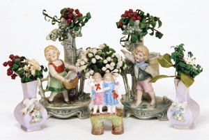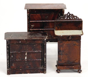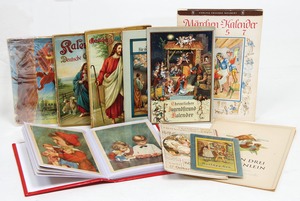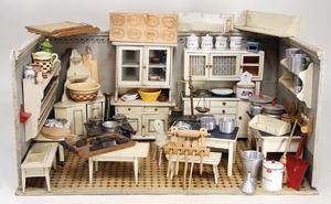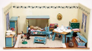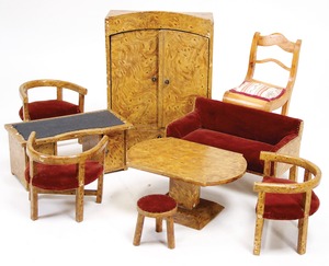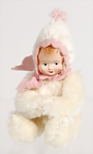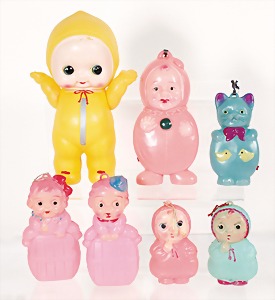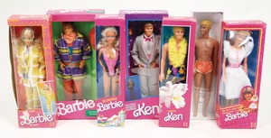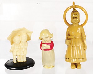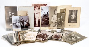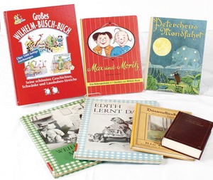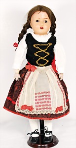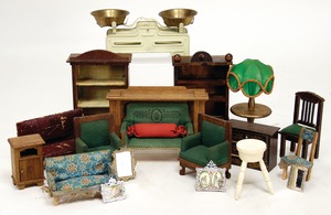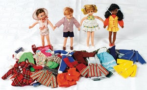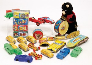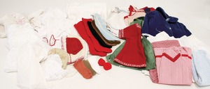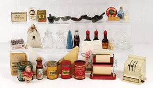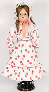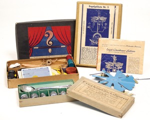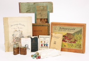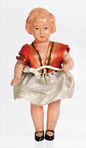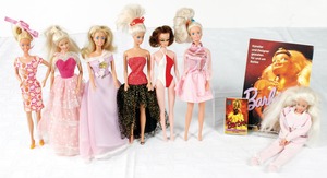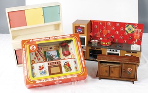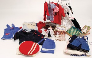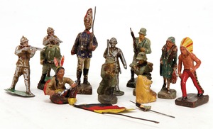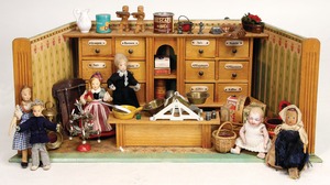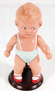 Konv. Masse, AM 520, Einbindekopf-Baby, 22 cm, blaue Schlafaugen, K&W 155/7, blaue Schelmenaugen, off. Mund, oben Zähne, Masse-Stehkörper, alte Kleidung, Kunsthaarperücke, Masse-Brustblattkopf-Puppe, gemalte Augen, Stoffkörper, Masse-Arme u. -Beine, 50 cm, durch Ziehen von Schnüren am Rücken bewegen sich die Beine, Spannungsrisse auf der Stirn sowie am Hinterkopf, Einbindekopf-Massebaby, Kunsthaarperücke, 1 Brustblattkopf-Puppe, 50 cm, Beine bewegl. durch Faden am Rücken, 1 Blech-Brustblattkopf-Puppe, Glasaugen Stoffkörper, Kunststoff-Hände, 25 cm, 1 Gummipuppe, altersbed. starke Rissbildung, Arm u. Bein getaped