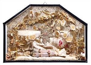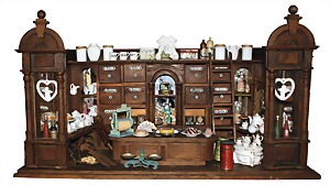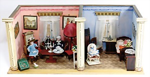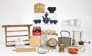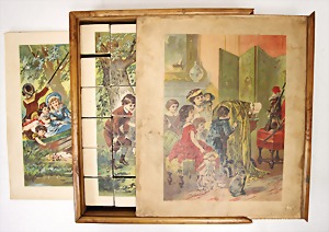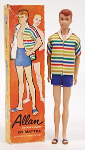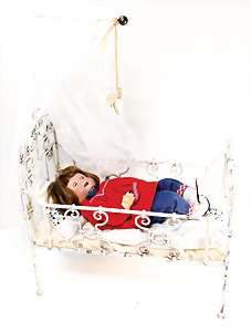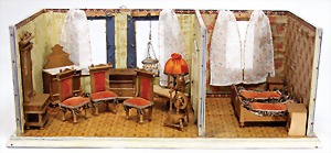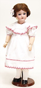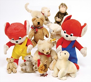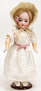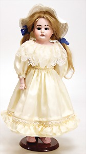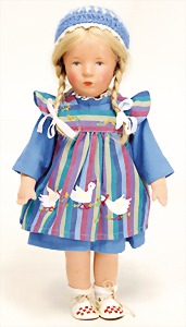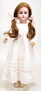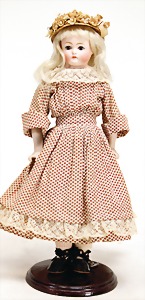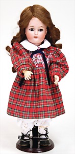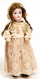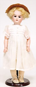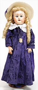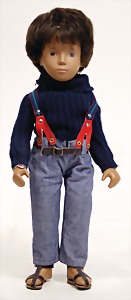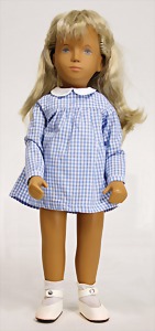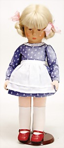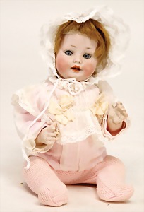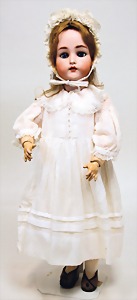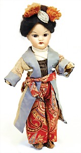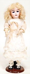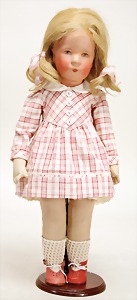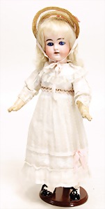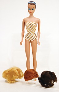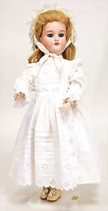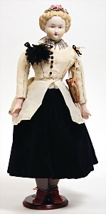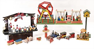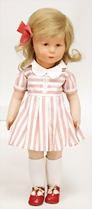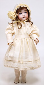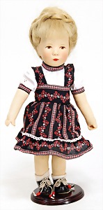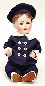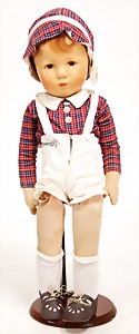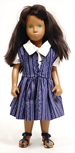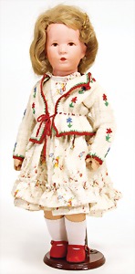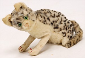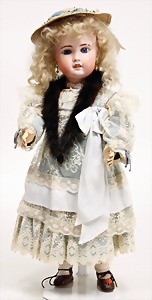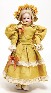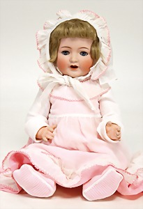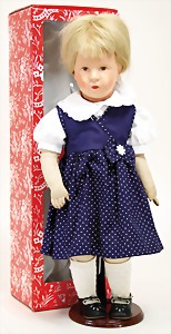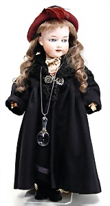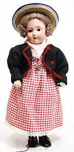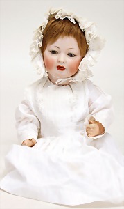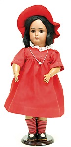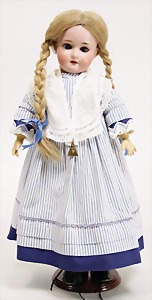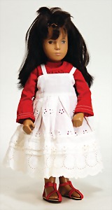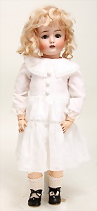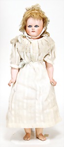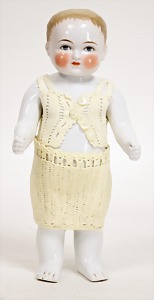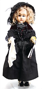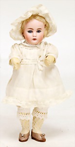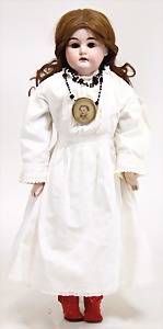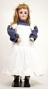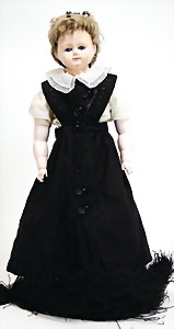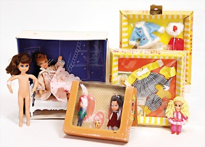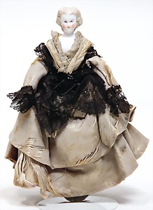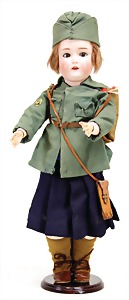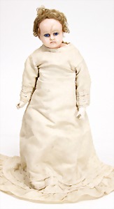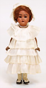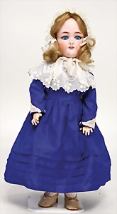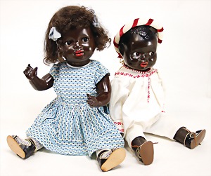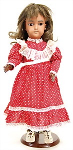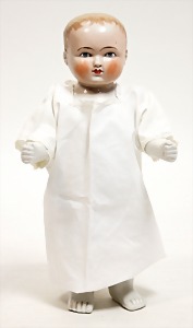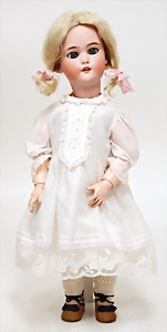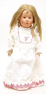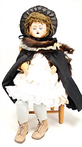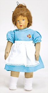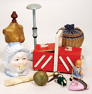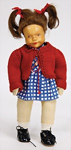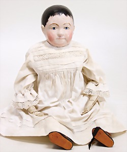 3 Puppen, Papiermaché u. Masse, 1 x dunkel gespritzt, ungem., braune Schelmenaugen, 43 cm, 1 x Brustblatt, blaue fest eingesetzte Glasaugen, geschl. Mund, Echthaarperücke, Wachstuchkörper, Masse-Hände, 40 cm, 1 x Papiermaché, Junge, Stoffkörper, Holzwolle gestopft, 32 cm, 1 Puppenbüste, Masse, 13 cm, 1 Pferd, Holz, auf Rädern, Länge 31 cm