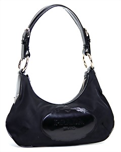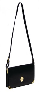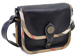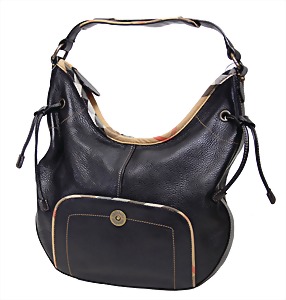 kl. Damentasche, schwarzes weiches Rindsleder, Enden mit dem typ. BURBERRY - Check-Stoff umrandet, Druckknopfverschluss, schwarzer Innenstoff, 1 gr. Fülltasche mit Reißverschluss, 1 Seitentasche innen, 1 größenverstellbarer Schulterriemen, H: 18 cm, B: 19 cm, minim. Gebrauchsspuren, sonst guter Zust.