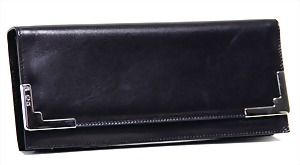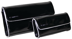 Damenhandtasche, Clutch, schwarzes Lackleder, weiß umrandet, 1 gr. Fültasche, 1 Seitentasche mit Reißverschluss innen, Innenfutter schwarz mit weißen Pünktchen, Magnetverschluss, mit "Nanni Due"-Prägung auf der Frontseite, H: 14 cm, B: 25 cm, T: 5,5 cm, dazu passende Kosmetiktasche, im Staubbeutel, neuw. Zust.