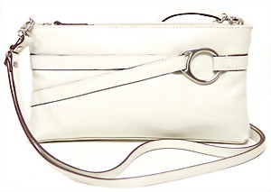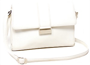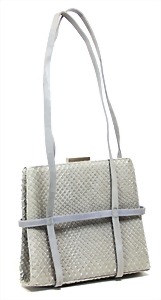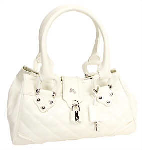 Damentasche, weißes Rindsleder, abgesteppt, 2 Trageriemen, silberne Messingbeschläge, mit Schloss und Schlüssel, innen 3 gr. Fülltaschen, mittig Tasche mit Reißverschluss, Boden mit 4 Füßen, ausgefallen, Gebrauchsspuren