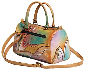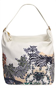 Damenshopper, weiches Kalbsleder, mit buntem Blumenprint, 1 Leder-Trageriemen, goldfarbener Reißverschluss, Innenfutter aus fliederfarbener Seide, 1 gr. Fülltasche, 1 Seitentasche mit Reißverschluss innen, Boden mit 4 Füßen, H. mit Trageriemen: 38 cm, B: 35 cm, leichte Gebrauchsspuren