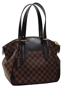 Damenhandtasche, Modell: Verona MM Damier Ebene, goldene Messingbeschläge, Schloss Nr. 313, mit 2 Schlüsseln, 2 größenverstellbare Trageriemen, auf Frontseite LOUIS VUITTON Paris Prägung, roter Innenstoff, 2 Seitentaschen innen, D-Ring zum Anbringen von Schlüsseln oder einer Pochette, 4 Füße, H: 28 cm, H: mit Trageriemen: 49 cm, B: 30 cm, T: 18 cm, neuw. Zust.