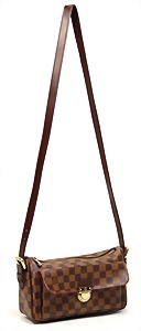 Damenhandtasche, Modell: Ravello Monogram Damier Ebene, 1 gr. Fülltasche mit Reißverschluss, 1 kl. Seitentasche innen, 1 aufgenähte Front-Tasche mit goldfarbenem Schnallenverschluss, innen aus rotem Wildleder, 1 größenverstellbarer Trageriemen, H: 16 cm, mit Trageriemen: ca. 72 cm, B: 26 cm, T: 8 cm, leichte Gebrauchsspuren an Schnalle und Zipper, sonst neuw. Zust.